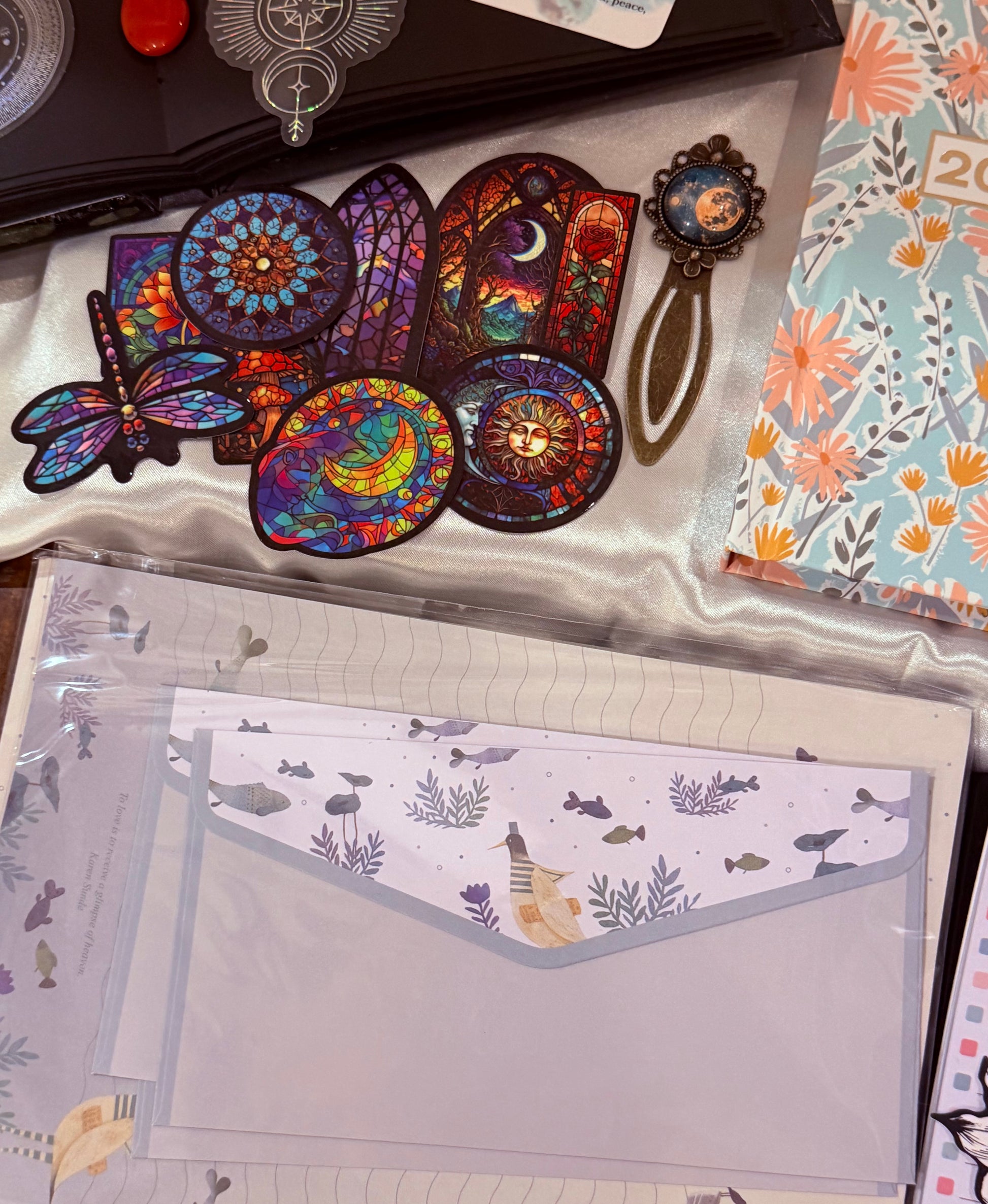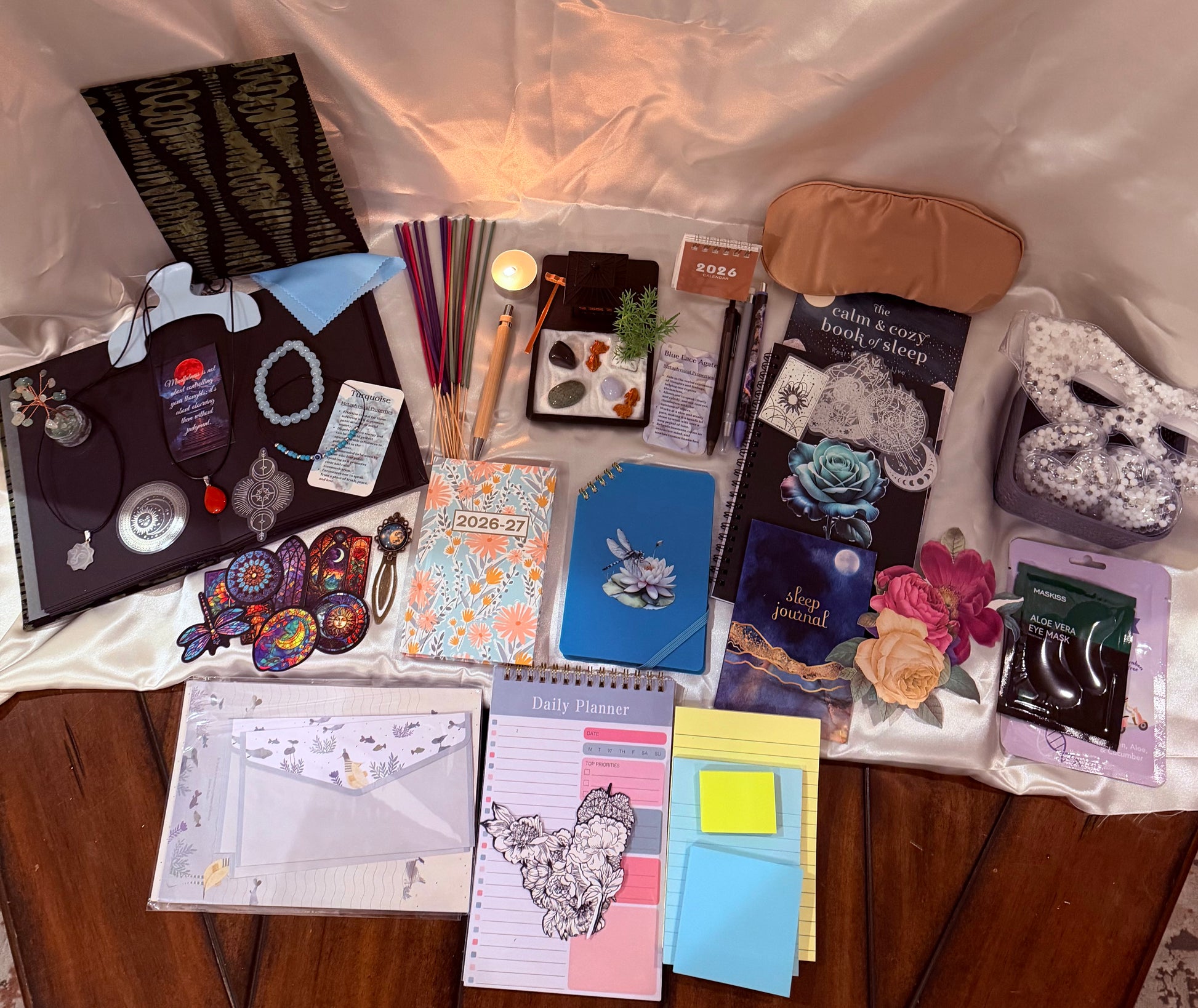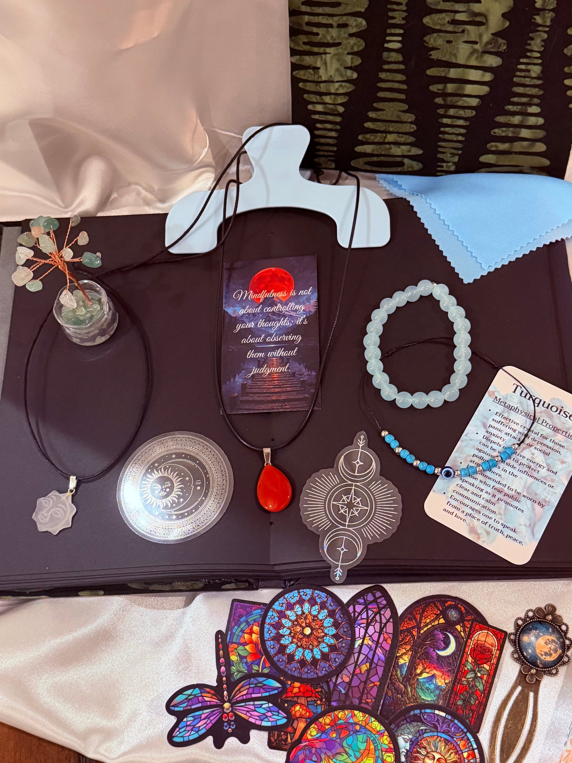 This curated mindfulness bundle has over 70 items some of which are hand crafted including a fabric covered 50 black page bound journal, a 3d printed rock garden with Koi fish, a mini blue flip spiral, a large black spiral, a miniature wish tree, two real stone bracelets and two real stone necklaces a personalized numerology chart and much more! This makes a perfect gift for anyone. Items included are as follows: