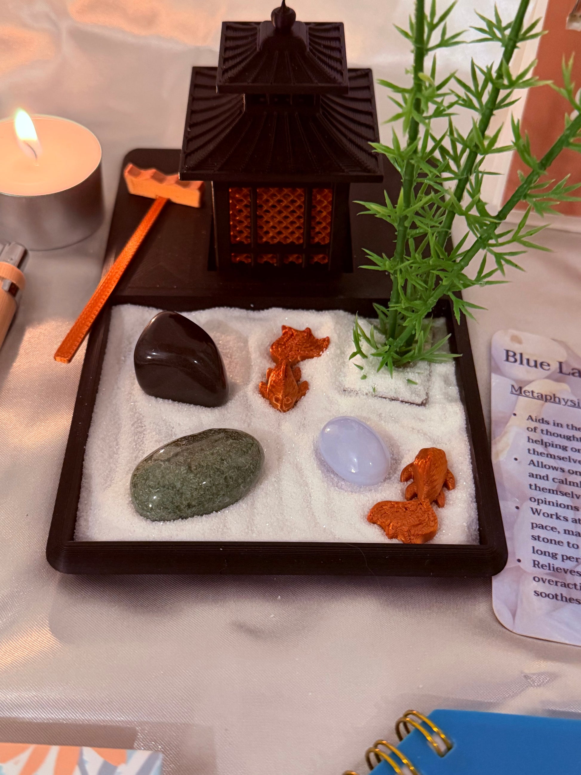 - Original design 3D printed rock garden with koi fish, rake, bamboo decoration, black agate rock, green agate rock, blue lace agate rock and fine white sand.